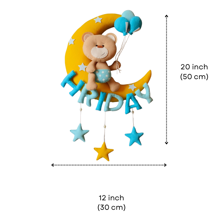Adorable Teddy on Moon with Balloons Wall Décor, lovingly handcrafted from premium Korean felt and filled with soft polyester fiber for a plush 3D look. Ideal personalized décor or gift for birthdays and naming ceremonies — Height 50 cm, Width 30 cm, Thickness 8 cm, includes hook for wall or door hanging.